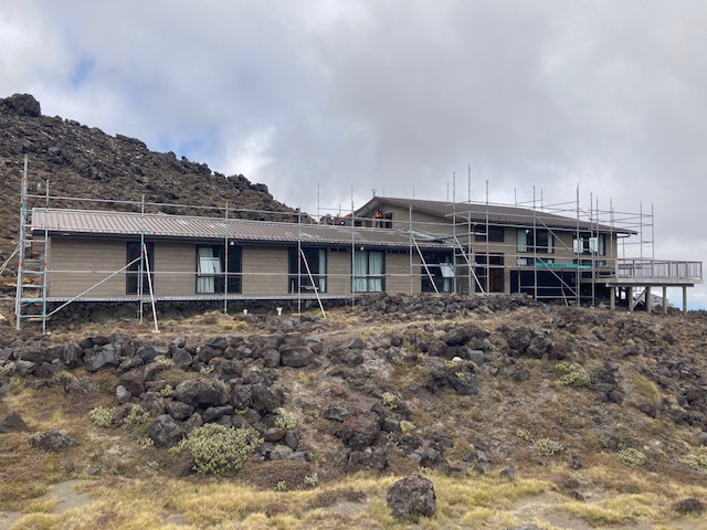 Just before Christmas, sixteen loads of scaffolding and timber were taken by helicopter from the Whakapapa car park to the hut. The scaffolding was erected in the first week of January and a team have been onsite undertaking the re-cladding. The building paper went on first (covering the existing cladding) and then cavity battens. The “smokey ash” Accoya weather boards will be finished in about two weeks. Some maintenance work was also done on the roof.